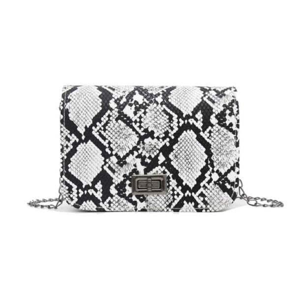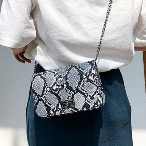 Structured snakeskin print clutch with magnetic closure flap. Vegan leather. Removable chain strap. Available in Grey and Tan.